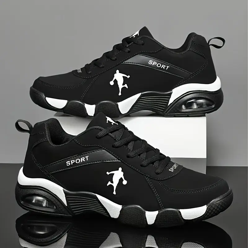 Breathable Mesh & PU Upper, Geometric Design, Lace-Up Closure, Black/White Colorway for Outdoor Running, Walking & Casual Attire.